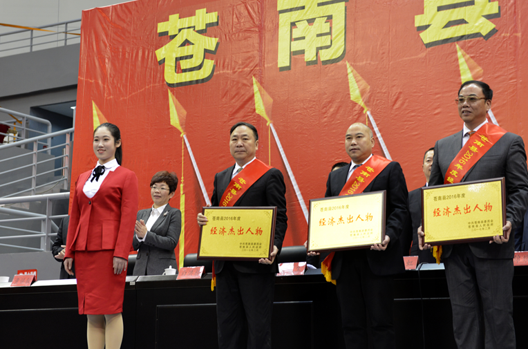 下午,灵溪镇干部大会在县人民大会堂召开,我公司再次捧回两项荣誉,其中天信获颁十佳突出贡献企业,范总个人获颁2016年度十佳优秀企业家。