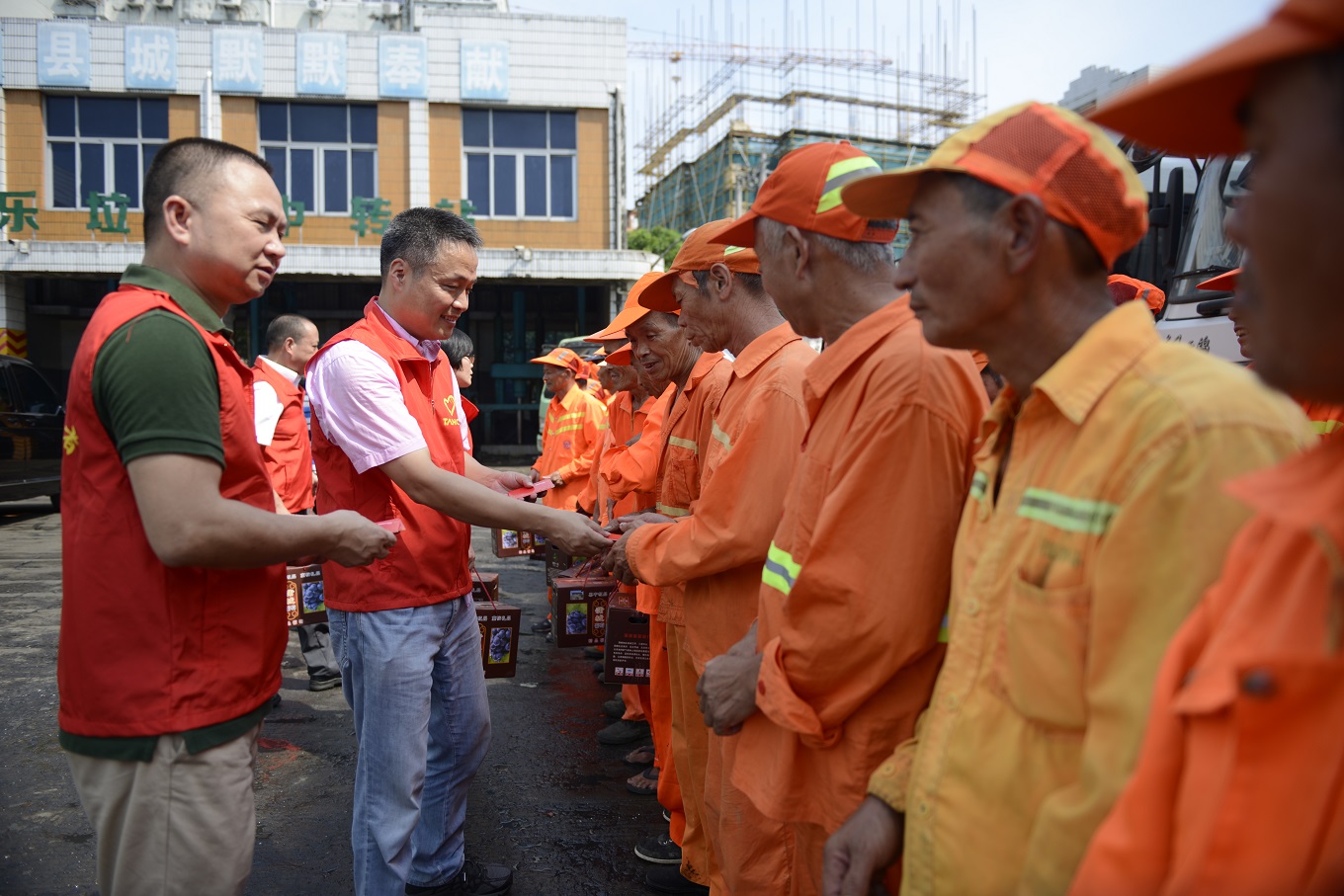 8月8日,天信公益志愿者服务队在公司副总裁张华的带领下,来到了位于康乐路的垃圾中转站,将面值200元的超市购物券和价值100元的葡萄逐一地发放到51位环卫工人手中。当拿到天信发放的清凉物资时,环卫工人们脸上露出了真切的笑容。他们纷纷对天信的微公益活动表示感谢,并表示要继续为美化城市环境做出更多的努力。