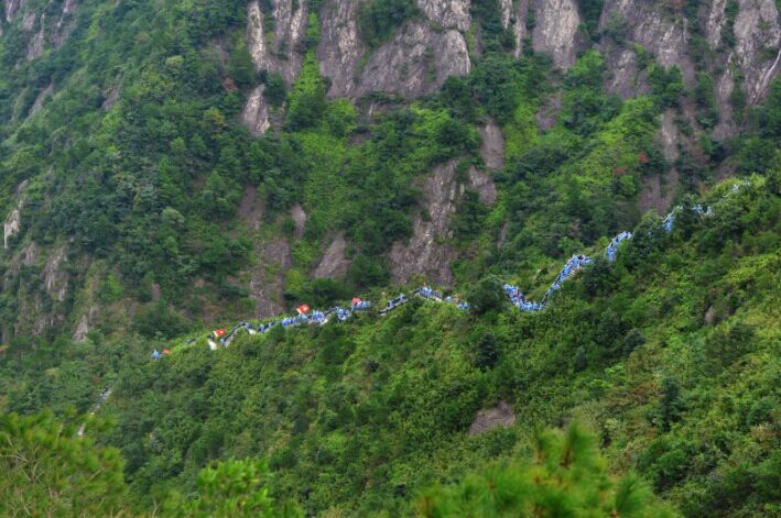 在整个行军过程中,最有挑战的路段莫过于三十六弯了,有些地方台阶的陡峭度甚至达到了六七十度,每跨上去一级,大腿就会又酸又疼,在互相鼓励下,天信队员们不放弃不抛弃,一步步坚持到底,终于站在了最高峰俯视群山,当美景尽收眼底的那一刻,大家纷纷拿出手机记录下这个难忘的旅程,并在微信、微博抢发,一瞬间朋友圈被红色正能量刷得满满的!