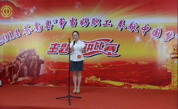 2014年7月22日下午,在苍南县“争当好职工,奉献中国梦”主题演讲比赛中,我公司选送的黄君用朴实的语言,真情的故事,鲜活的事迹,讲述了她的追梦故事,荣获了第二名的好成绩。